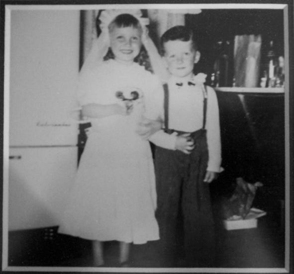 Betty Ann Rose became my first “bride” at the fiftieth wedding anniversary of my grandparents, Henry and Bertha. We were six or seven years old. I have no personal recollection of this event except for the grainy, 8mm movie my father had recorded of the two of us dancing while my grandparents, beers in hand, looked on. Betty Ann was half a head taller than me. She wore a white dress (probably worn at her First Communion), and I wore a white shirt, dark trousers with suspenders. We were quite the couple!